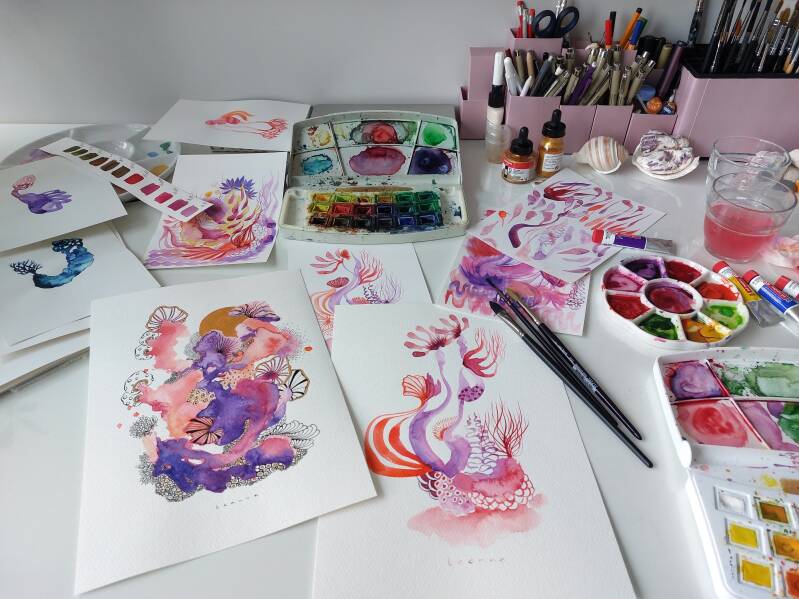 In this blog, I am going to show you step by step how to make a watercolour and pen illustration. Even if you have never painted with watercolour before, you will surely succeed if you follow the steps! The watercolour illustration is made of two colours that go together beautifully. We use the wet-on-wet technique.