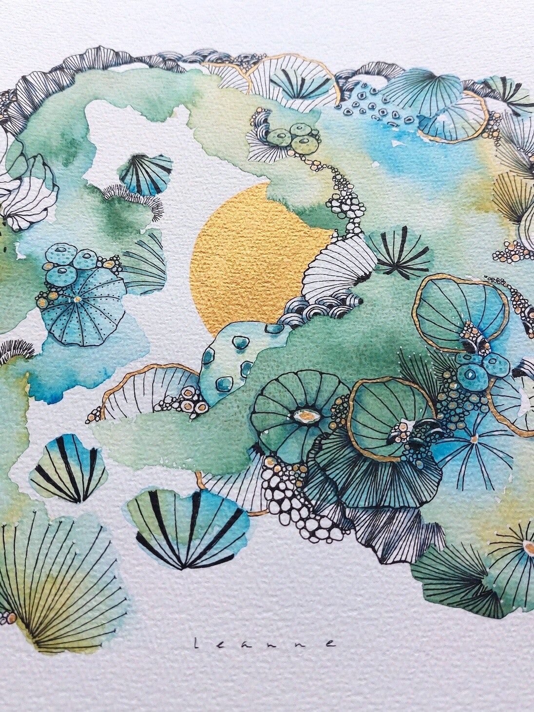 Original, one of a kind handmade drawing. With watercolor and acrylic golden ink.