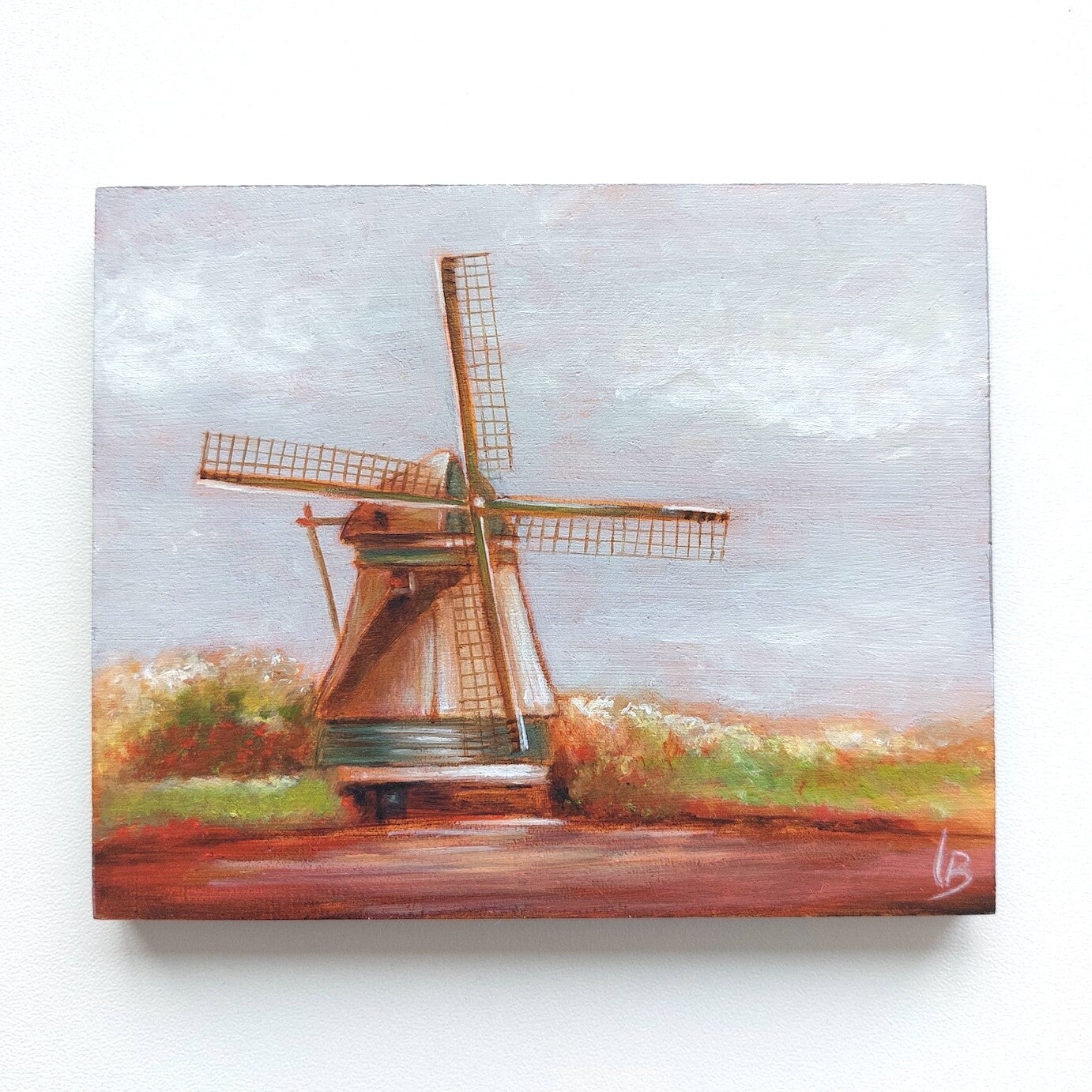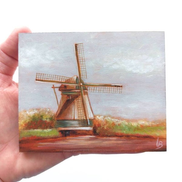 Original windmill oil painting on a small panel.