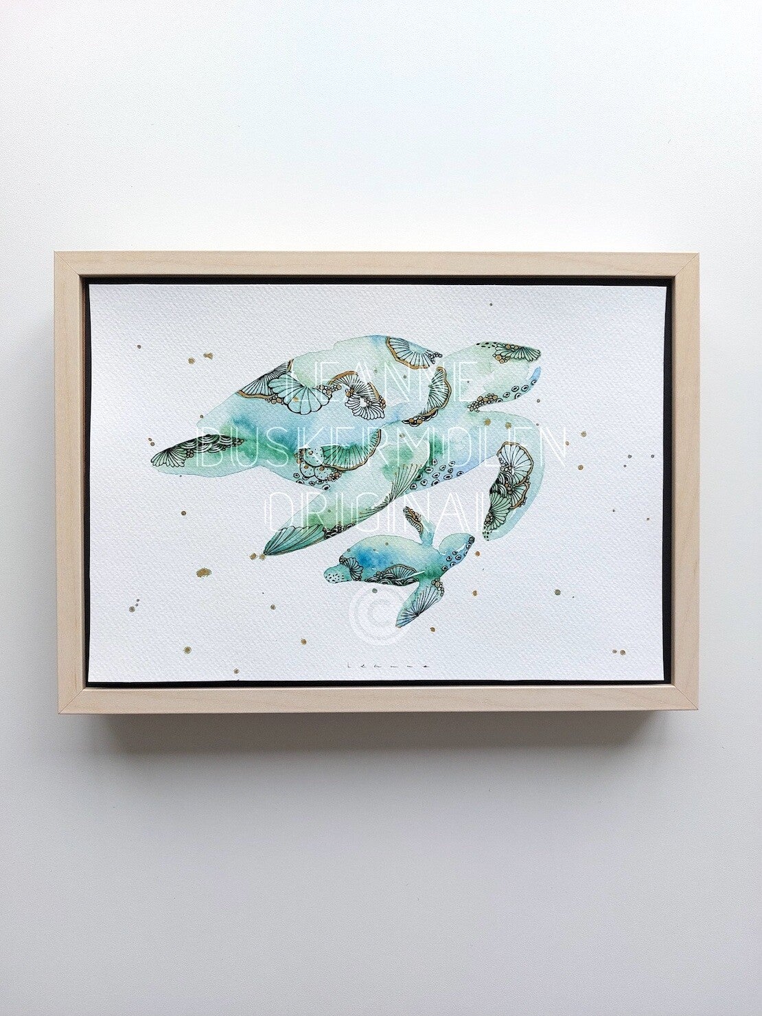 Two turtles in watercolours, with black ink drawing and golden ink details.