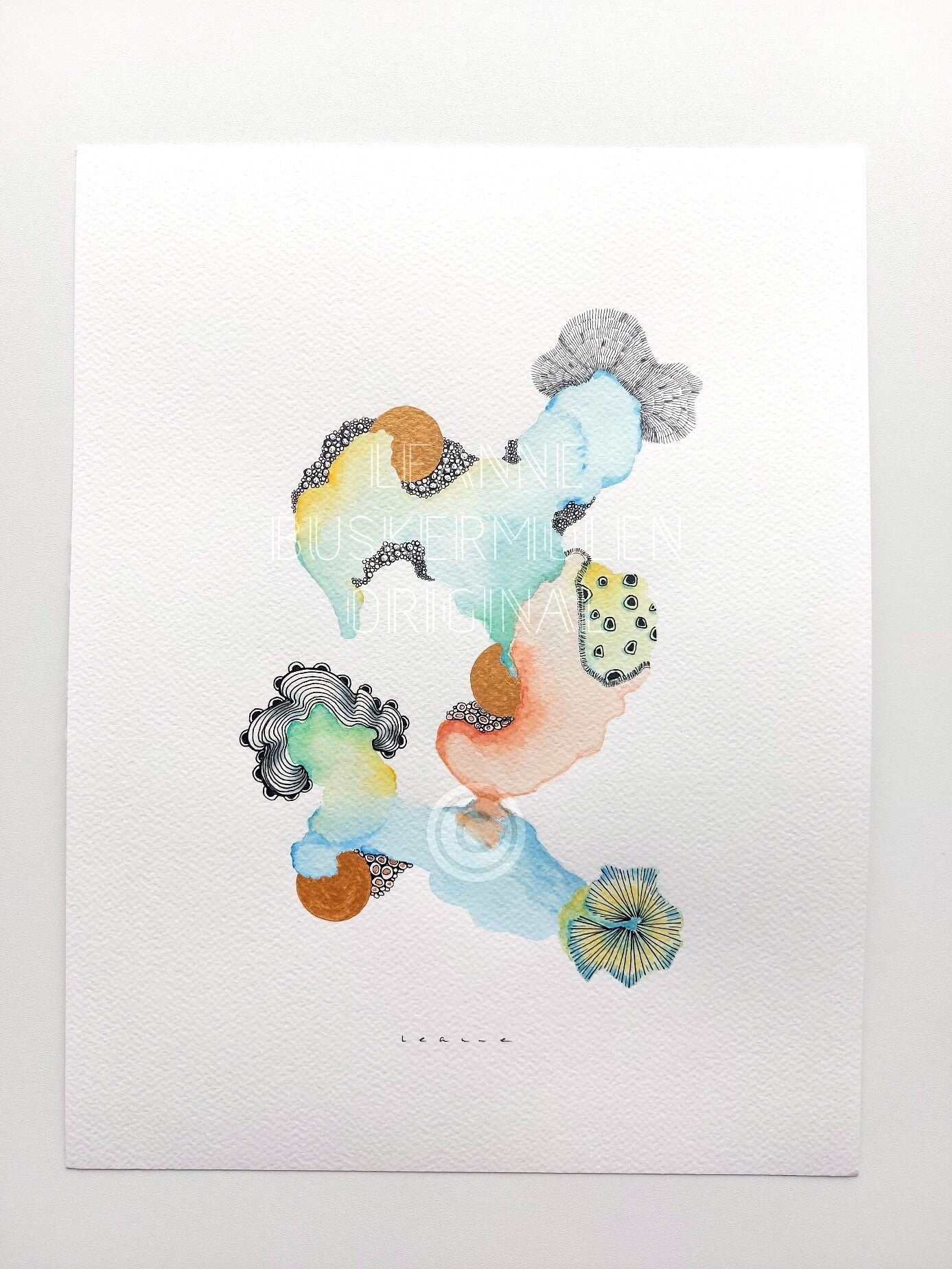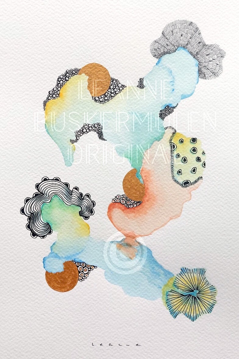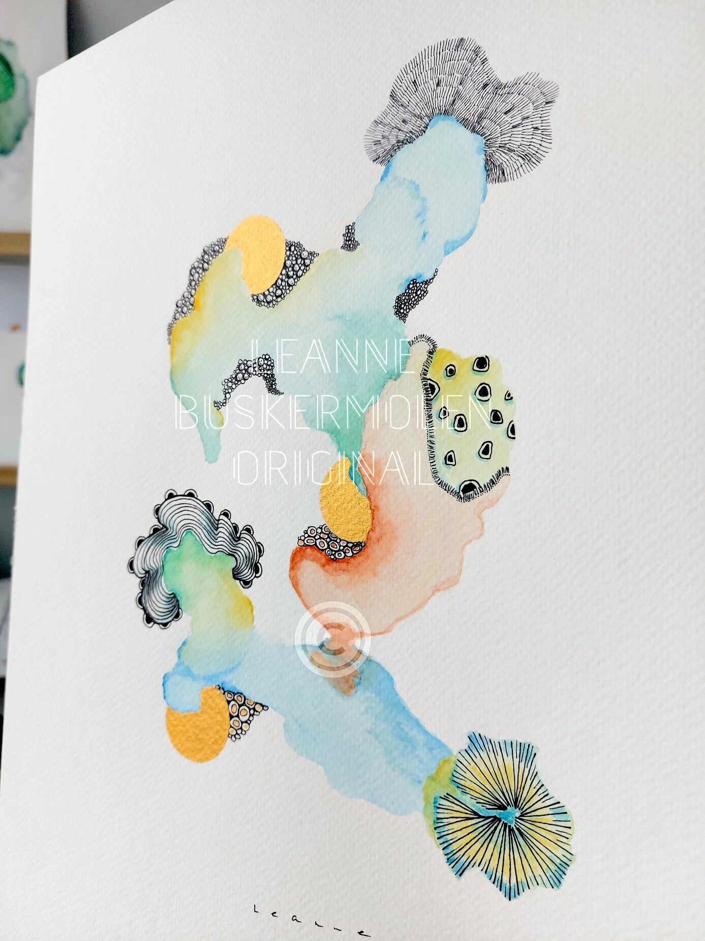 Watercolor in the tones green, blue, orange, yellow with golden details.