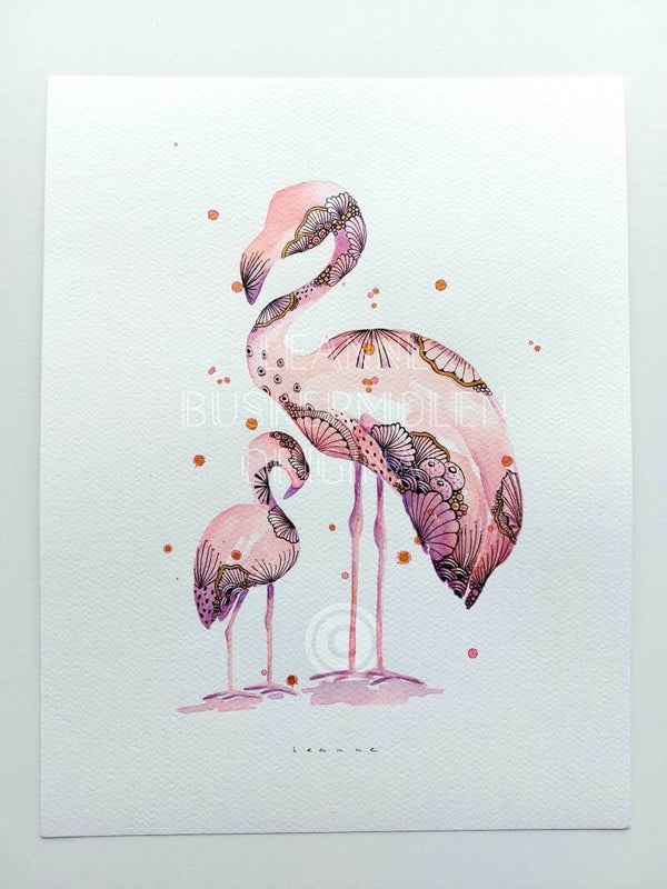 Two flamengos in watercolours, with black ink drawing and golden ink details.