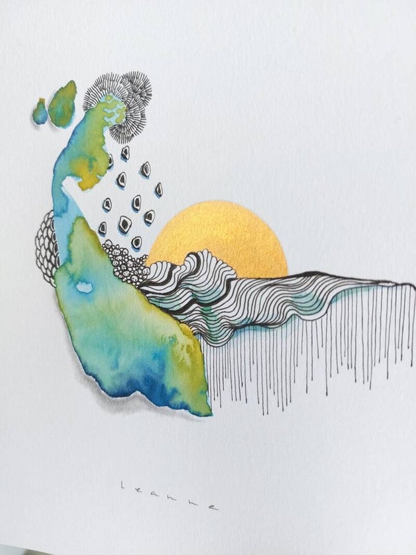 Watercolor in the tones blue, green, yellow and gold shimmer.