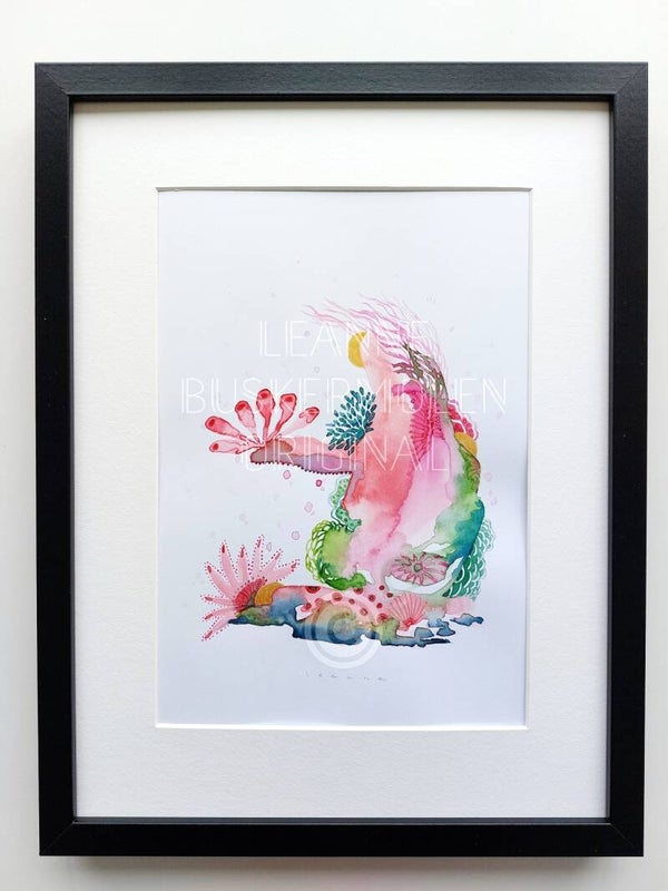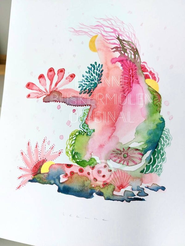 Watercolor in the tones green & pink. With golden accents.