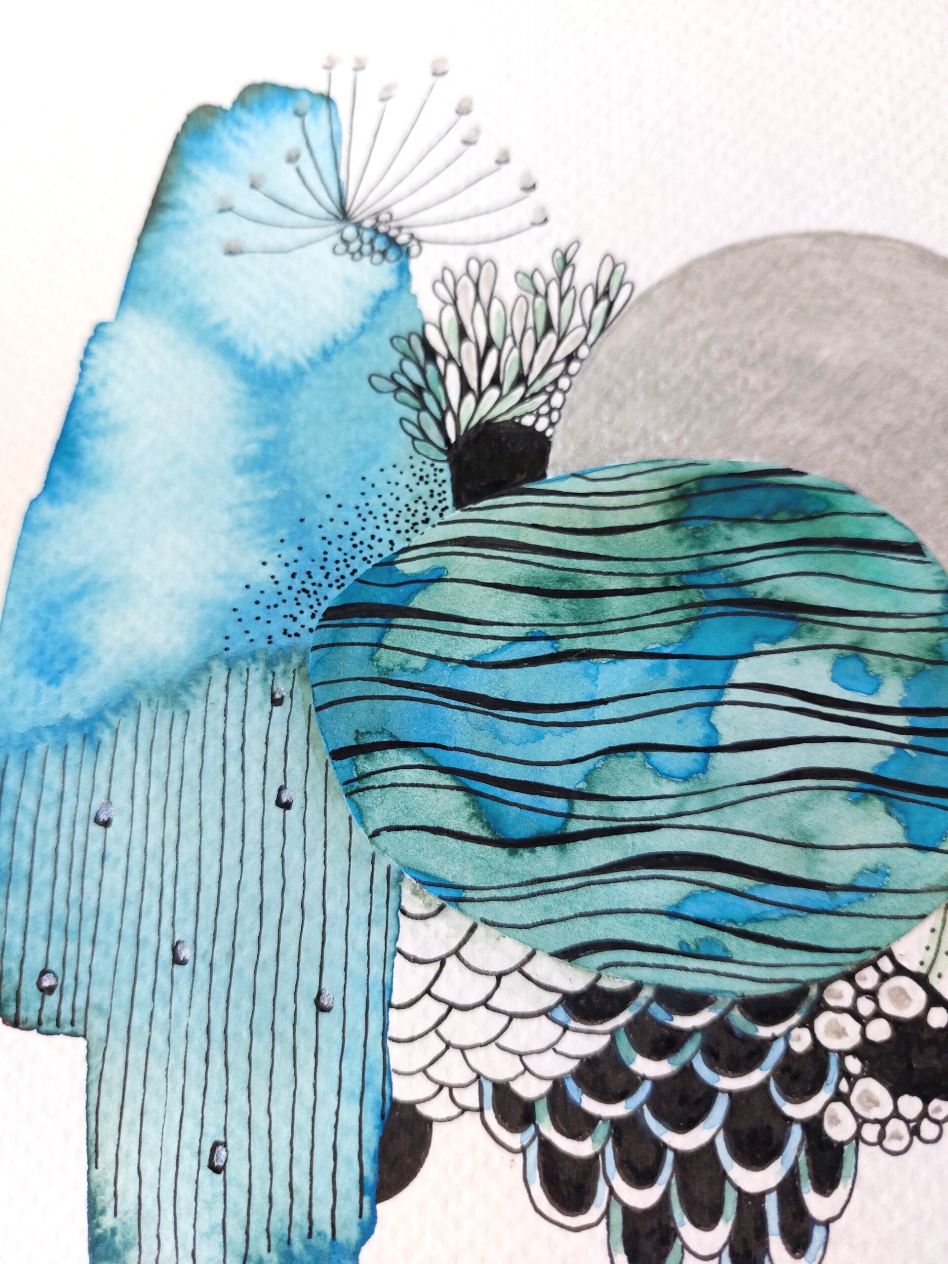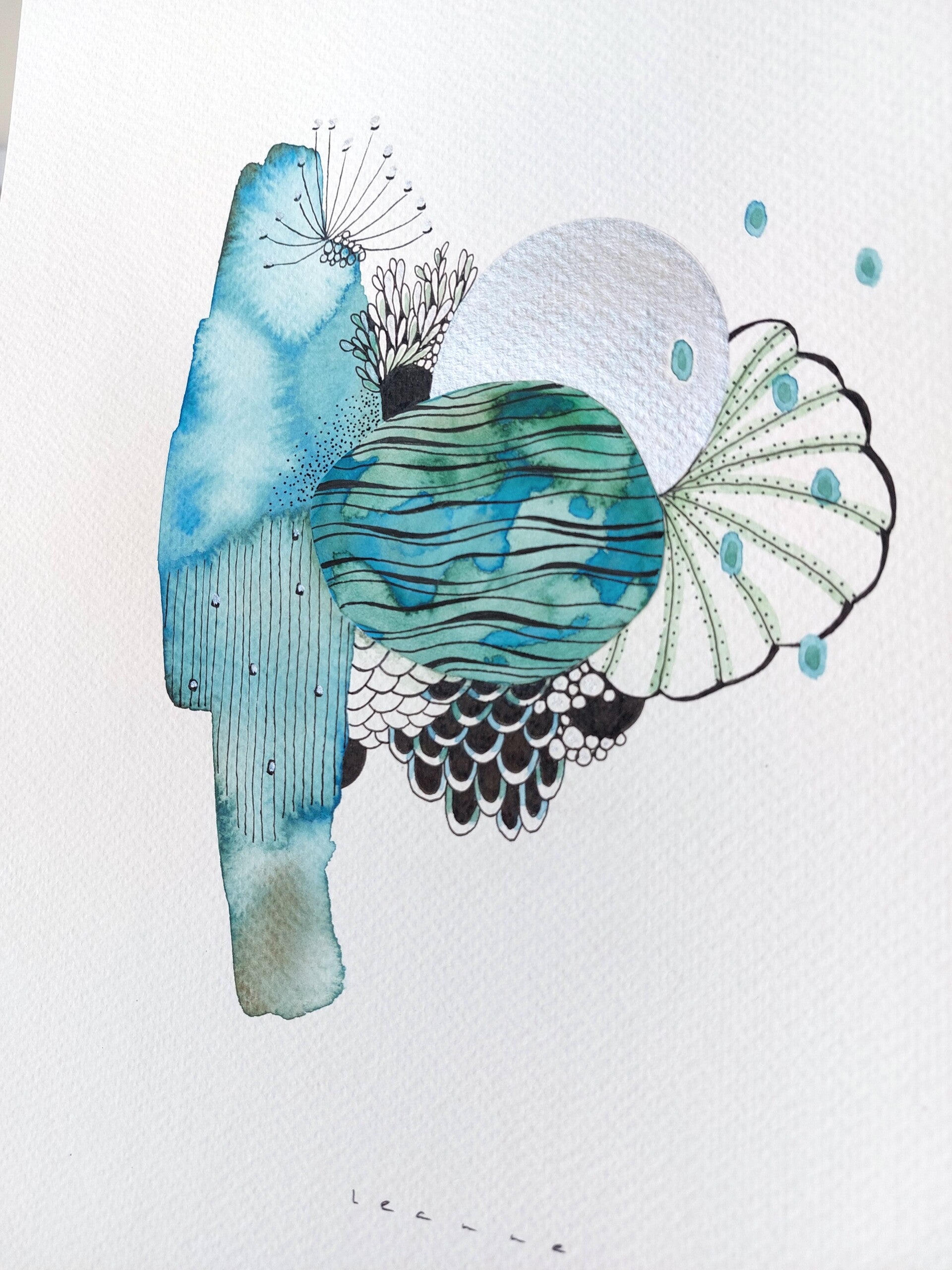 Watercolor in the tones blue, green & silver.