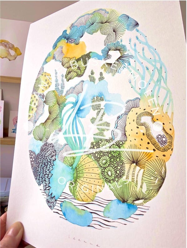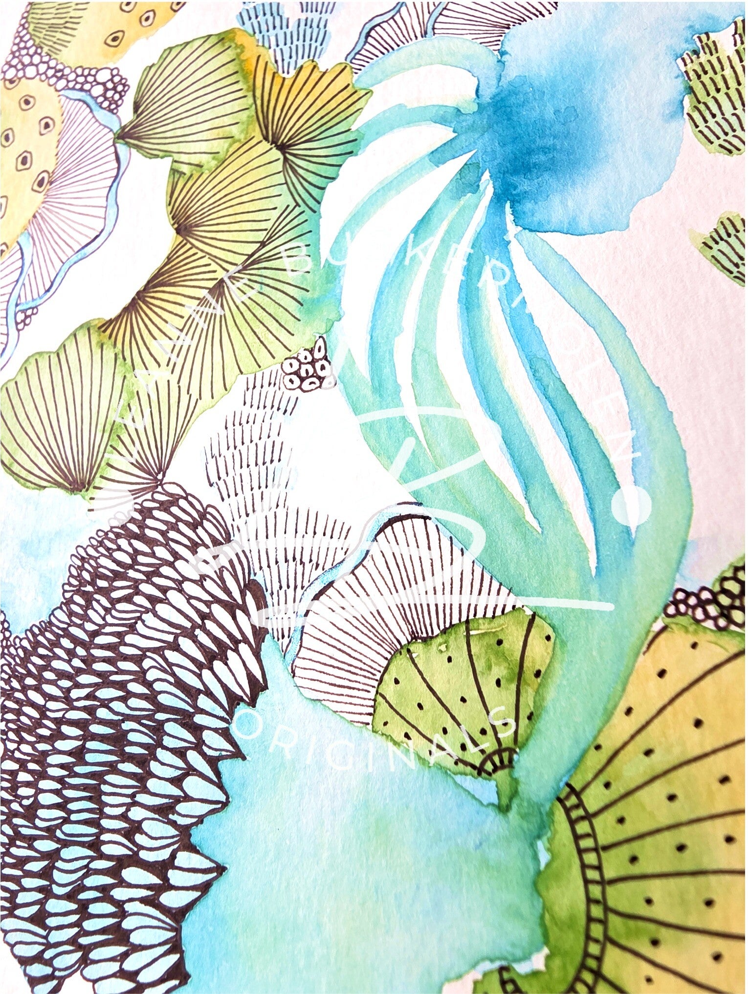 Watercolour in the tones blue, yellow and green. Blue shimmer details.