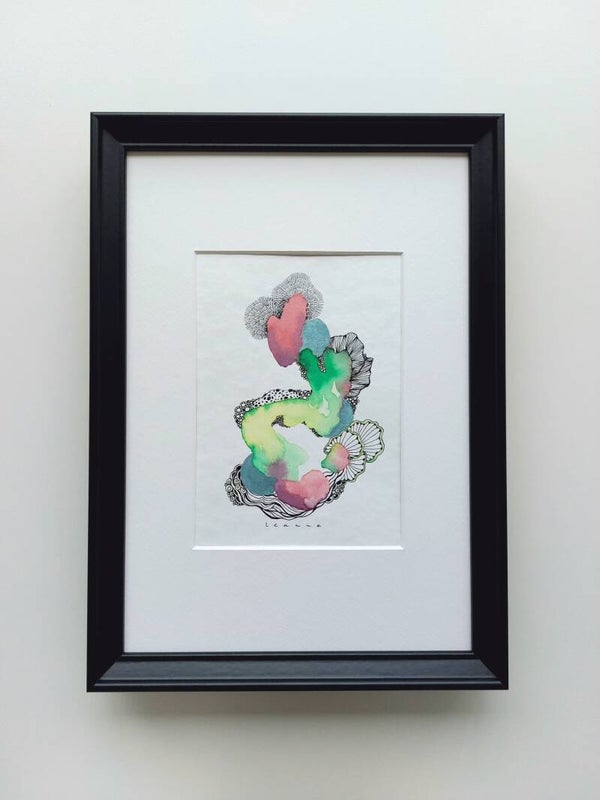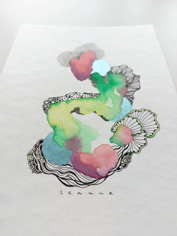 Watercolor in the tones pink, green, yellow and blue metallic shimmer.